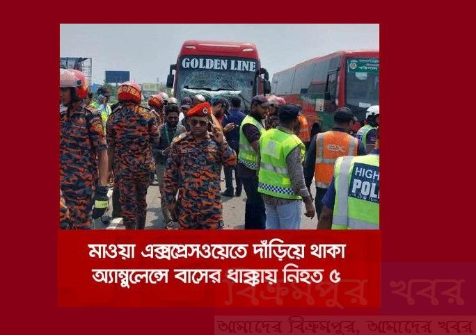বিক্রমপুর খবর:শ্রীনগর প্রতিনিধি : ঢাকা-মাওয়া এক্সপ্রেসওয়ের মুন্সিগঞ্জের সিরাজদিখানের নিমতলা এলাকায় থেমে থাকাঅ্যাম্বুলেন্সকে বাসের চাপায় সংঘর্ষের ৫যাত্রী নিহত হয়েছে। এ ঘটনায় গুরুত্বর আহত হয়েছে আরও ৩জন। বৃহস্পতিবার দুপুর ১ টার দিকে এ ঘটনা ঘটে।