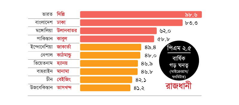 তালিকায় থাকা শীর্ষ ১০ দেশের সবই এশিয়ার। বাংলাদেশের পর শীর্ষ তালিকায় থাকা অন্য দেশগুলো হলো পাকিস্তান, মঙ্গোলিয়া, আফগানিস্তান, ভারত, ইন্দোনেশিয়া, বাহরাইন, নেপাল, উজবেকিস্তান ও ইরাক। বাতাসে ক্ষুদ্র বস্তুকণা পিএম ২.৫-এর উপস্থিতি বিবেচনায় ৮৩ দশমিক ৩ স্কোর নিয়ে দূষিত রাজধানীর তালিকায় ঢাকার অবস্থান দ্বিতীয়। এক্ষেত্রে শীর্ষে থাকা ভারতের রাজধানী নয়াদিল্লির স্কোর ৯৮ দশমিক ৩। এ তালিকায় দ্বিতীয়বারের মতো শীর্ষে অবস্থান করছে প্রতিবেশী দেশের রাজধানী শহরটি।